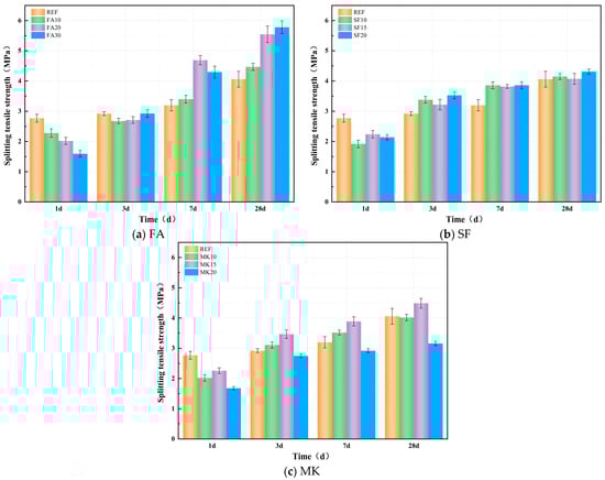 Figure 10a–c show the effect of FA, SF, and MK on the splitting tensile strength of geopolymer paste. From Figure 10a, it can be observed that the incorporation of FA exhibits a two-stage development pattern in splitting tensile strength. During the early reaction stage, the splitting tensile strength of specimens decreases with increasing FA dosage. After 1 day, the splitting tensile strengths of FA10, FA20, and FA30 are 17.69%, 27.20%, and 42.43% lower than the reference group, respectively. As the curing age progresses, the growth rate of splitting tensile strength in FA-incorporated specimens gradually accelerates, and the strength increases with higher FA dosages. At 7 days, the splitting tensile strengths of FA10, FA20, and FA30 are 6.26%, 46.56%, and 34.23% higher than the reference group, respectively. At 28 days, the strengths of FA10, FA20, and FA30 exceed the reference group by 10.03%, 36.53%, and 42.40%, respectively. This phenomenon is attributed to the low pozzolanic activity of FA, which results in slower early-stage reactions. As curing progresses, the pozzolanic activity of FA gradually develops, facilitated by the sustained activation of alkaline activators. Additionally, the micro-aggregate filling effect of FA contributes to an increased packing density of the slurry, which improves the overall compactness of the matrix. This enhanced microstructure results in a continuous improvement in the splitting tensile strength of the material.