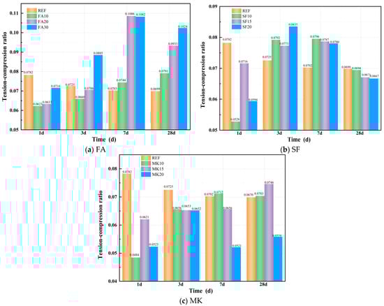 Figure 11a–c show the effect of FA, SF, and MK on the tension–compression ratio of geopolymer paste. From Figure 11a, it can be observed that the incorporation of FA specimens shows that the tension–compression ratio is lower than that of the FA-free reference group during the early reaction stage (1 d). After 1 day, the tension–compression ratios of FA10, FA20, and FA30 decreased by 20.41%, 19.08%, and 8.47%, respectively, compared with the reference group. As the curing age progresses, both the compressive strength and splitting tensile strength growth rates of the FA-incorporated specimens gradually accelerate. In contrast, the later-stage increase in splitting tensile strength becomes more pronounced with higher FA dosages. By 28 days, the tension–compression ratios of FA10, FA20, and FA30 exceed the reference group by 13.28%, 33.58%, and 46.58%, respectively.