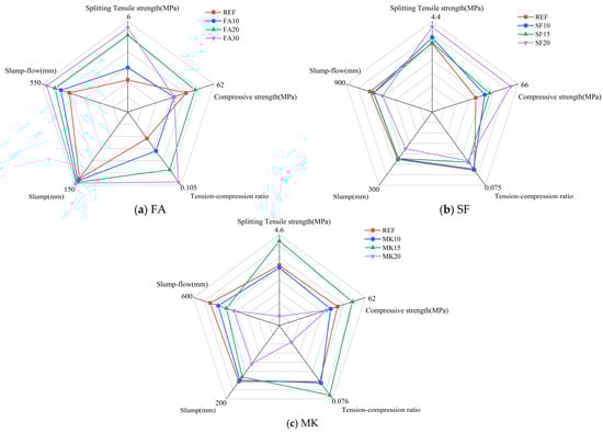 Based on the experimental results, this study selected five indicators—compressive strength, splitting tensile strength, tension–compression ratio, slump, and slump flow spread—and conducted comparative analyses using a five-dimensional evaluation method [49]. The compressive strength and splitting tensile strength of the specimens were tested after 28 days of standard curing (20 ± 2 °C, ≥95% relative humidity). Through multi-dimensional assessment, the optimal dosages of FA, SF, and MK were proposed. The multi-dimensional evaluation of slag–Yellow River silt-based geopolymers with varying dosages of mineral admixtures is shown in Figure 12. As seen, a 30% FA dosage results in a significant improvement in workability, splitting tensile strength, and the tension–compression ratio compared with the reference group. The compressive strength is only 2.85% lower than the reference, indicating balanced overall performance. At a 20% SF dosage, the geopolymer demonstrates substantial improvements in both splitting tensile and compressive strengths, indicating superior mechanical properties. However, practical construction requires attention to the workability of the mixture to avoid negative impacts on forming quality. At a 15% MK dosage, the geopolymer shows notable improvements in splitting tensile strength, compressive strength, and tension–compression ratio, providing well-rounded mechanical performance.