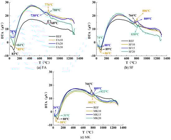 A ZCT-B simultaneous thermal analyzer (Beijing Jingyi Hitechinstrument Co., Ltd., Beijing, China) was employed, with the test sample weighing approximately 15 mg. The heating rate was controlled at 10 °C/min, and the maximum temperature was raised to 1000 °C. The DTA curves for each group of samples were obtained.