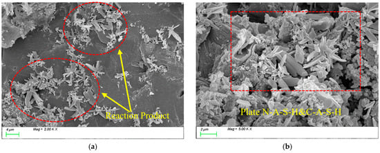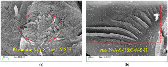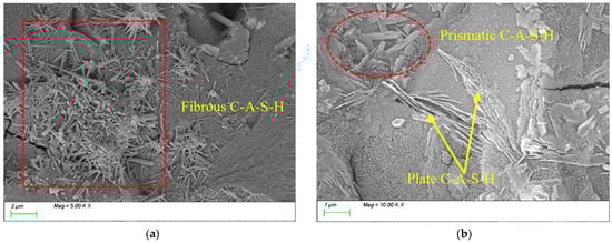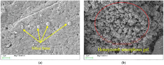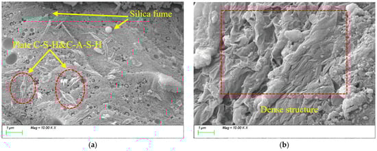The microstructure of the samples was observed using a Sigma 300 field emission environmental scanning electron microscope (Carl Zeiss AG, Oberkochen, Germany). After curing to the 28 d age, the samples were broken with pliers, and hydration was stopped before testing [47].