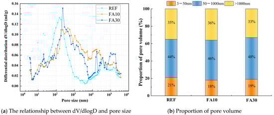 Figure 6b illustrates the influence of FA dosage on the cumulative hydration heat. As shown in the figure, the cumulative hydration heat decreases with increasing FA dosage. After 24 h of cumulative heat release, the reference group exhibited a hydration heat of 114.4 J/g, while FA10, FA20, FA30, and FA50 showed hydration heats of 107.2 J/g, 102.4 J/g, 96.1 J/g, and 63.4 J/g, respectively. These values represent reductions of 6.27%, 10.50%, 15.98%, and 44.60% compared with the reference group. After 72 h of cumulative heat release, the reference group exhibited a hydration heat of 144.8 J/g, while FA10, FA20, FA30, and FA50 showed hydration heats of 137.8 J/g, 133.3 J/g, 126.7 J/g, and 93.2 J/g, respectively. These values represent reductions of 4.79%, 7.93%, 12.50%, and 35.59% compared with the reference group.