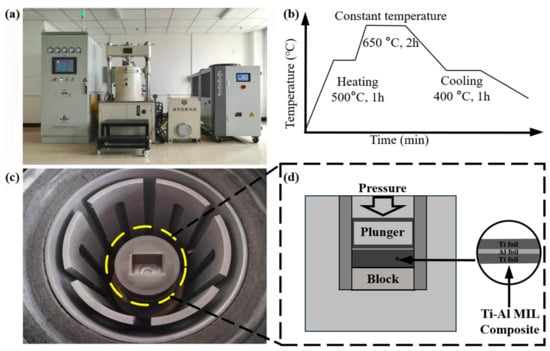The preparation process of the Ti-Al3Ti target includes two steps: pretreatment and heat treatment. In the pretreatment step, Ti-6Al-4V (Ti) with a thickness of 100 µm and aluminum (Al) foil are cut into 100 mm × 100 mm rectangles. Table 1 presents the chemical compositions of each metal foil. Then, they are etched separately in designated solutions containing 87% nitric acid + 10% HF + 3% water and 20% sodium hydroxide. In the heat treatment step, Ti and Al foil are alternately stacked to form a laminated structure. Subsequently, they are sintered in a vacuum hot press (ZT-40-21Y). Specific manufacturing parameters, including the reaction temperature, pressure, and processing time, are shown in Figure 1.