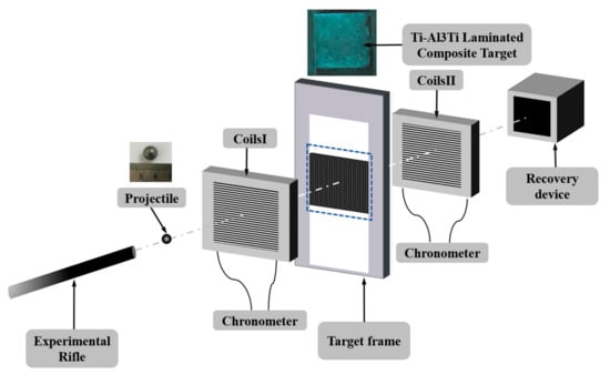 In this study, penetration tests of the Ti-Al3Ti target were conducted according to the GA 950-2019 testing standard [21]. The experimental setup included a test rifle, projectiles, two velocity measurement coils and a chronometer, target supports, and projectile recovery devices. Specifically, a 12.7 mm rifle was used, with a firing distance of 6 m. The projectiles were tungsten alloy spherical fragments with a diameter of 9.45 mm and a mass of 8.1 g. The specific principles of penetration testing are shown in Figure 2. The projectiles were fired vertically at the target using the test rifle at a certain velocity controlled by the amount of gunpowder. A velocity measurement coil was placed in front and behind the target support, connected to a timer to record the initial and remaining velocities of the projectiles. The support was fixed on both sides of the target to position it in the middle of the support. A recovery device was used to collect the remaining projectiles after piercing the target and fragments from the back of the impacted target.