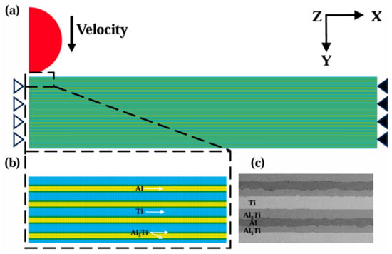 (a) Finite element model of the projectile and Ti-Al3Ti MIL composite and boundary constraints. (b) Schematic diagram of the mesh partitioning. (c) Microstructure of Ti-Al3Ti MIL composite.