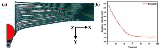 (a) Simulation result and (b) residual velocity–time relations of projectile penetration of the Ti-Al3Ti targets containing Ti with a 0.1 mm thickness with 533 m/s initial velocity.
