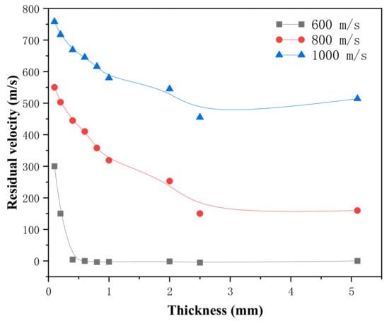 Based on the results of Section 3.1, we conducted corresponding finite element simulations for the Ti-Al3Ti MIL composite targets with different Ti layer thicknesses to explore the influence of the variation in Ti layer thickness on the anti-penetration performance of Ti-Al3Ti MIL composites under different impact velocities. The Ti layer thicknesses examined were 0.1 mm, 0.2 mm, 0.4 mm, 0.6 mm, 0.8 mm, 1 mm, 2.5 mm, and 5.1 mm. The initial velocities of the projectile were 400 m/s, 600 m/s, 800 m/s, and 1000 m/s, and the numerical simulation results are shown in Table 6.