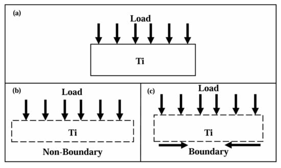 Schematic diagram of heterogeneous structure deformation: (a) single-layer target, (b) without boundary constraint, (c) boundary constraint.