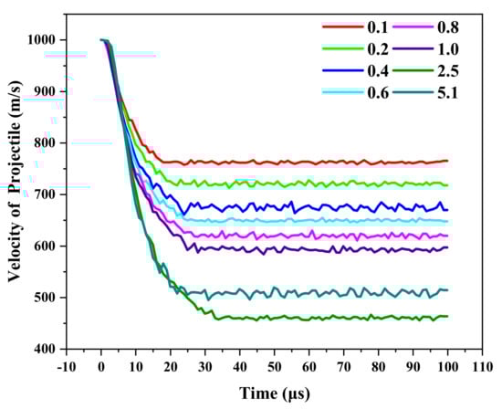 During the penetration process, the loading form of the laminated composite has a great influence on the anti-penetration performance of the target, which is closely related to the thickness of each layer. It can be seen from Figure 7 that with the increase in the layer thickness, the velocity of the projectile decreases more in the cratering stage; in the stable penetration stage, the interaction time between the projectile and the target increases, and the slope of the velocity change increases.