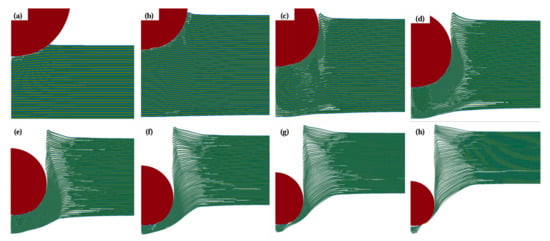 Penetration process of the Ti-Al3Ti MIL composite target with Ti thickness of 0.1 mm, in which a tungsten alloy projectile with an impact velocity of 1000 m/s was employed in FEA: (a) t = 2 μs, (b) t = 5 μs, (c) t = 7 μs, (d) t = 10 μs, (e) t = 13 μs, (f) t = 17 μs, (g) t = 20 μs, (h) t = 24 μs.