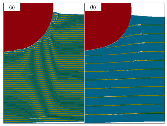 The simulations were conducted using a commercial explicit code LS-DYNA (Livermore Soft Technology Corporation, Livermore, CA, USA). According to the Johnson–Cook model, the dynamic flow stress is described by the strain, strain rate, and temperature, and the constitutive equation is expressed as Equation (1).