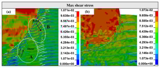 Maximum shear stress nephogram around the projectile with a Ti thickness of 0.1 mm (a) and 0.8 mm (b) at 5 μs.