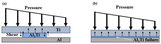 It is worth noting that in Figure 9, compared with the Ti-Al3Ti MIL composite target with a millimeter-level thickness of the Ti layer, the bending phenomenon of the ductile layer in the target with a micron-level thickness of the Ti layer will be aggravated. This is caused by the combined action of the non-uniform stress transfer caused by the local failure of the brittle Al3Ti and the tensile stress wave generated at the free interface, as shown at B in Figure 10a. In the vertical thickness direction, due to the change in the load transfer form, the velocities of the projectile in Ti—0.8 mm and Ti—0.1 mm are 900 m/s and 930 m/s, respectively. In addition, we checked the maximum shear stress nephogram of the target, and the results show that the un-failed Ti–Al3Ti structure has a shearing effect on the Ti and Al layers, as shown at A in Figure 10a, which weakens the residual strength of the ductile layer. The schematic diagram of the force on the target is shown in Figure 11. According to the mechanics of the materials, the penetration resistance generated in Figure 11a is lower than that in Figure 11b, because the Ti layer is more likely to break under the multiple actions of shear and compressive loads. In general, the significant increase in the Ti layer thickness improves the anti-penetration performance of the target by changing the adverse effects of the bending stacking and uneven stress distribution of the material in the cratering stage on the anti-penetration performance of the target.