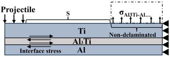 In addition, during the stable penetration process, since the tensile strength of Al3Ti is much lower than its compressive strength, the penetration resistance provided by the non-separated interface gradually decreases, and the flexural strength of the remaining material of the target is the main penetration resistance. Since Al3Ti absorbs a large amount of impact load and fails and delaminates in the cratering stage, a thicker Ti layer will increase the anti-penetration ability of the target through higher flexural strength, as shown in Figure 12, σAl3Ti is gradually decreased, and the distance (S) between the load and the delaminated interface is increased. According to the mechanics of the materials, the anti-penetration ability of the target decreases. This tearing delamination phenomenon is the same as that in the research of Yuan [8].