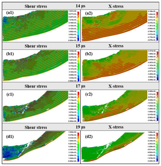 Shear stress and x-direction stress distribution of 14–19 μs punching plug of target plate. Shear stress (a1) 14 μs, (b1) 15 μs, (c1) 17 μs, (d1) 19 μs. X-direction stress (a2) 12 μs, (b2) 13 μs, (c2) 14 μs, (d2) 19 μs.
