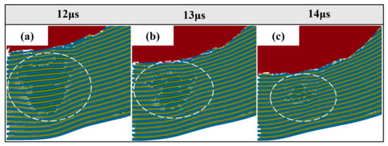 Schematic partial shear. (a) 12 μs, (b) 13 μs, (c) 14 μs.