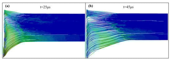 The perforation stage occurs between 25 μs and 45 μs. At this stage, depending on the penetration velocity and the thickness of the Ti layer, the projectile may penetrate, rebound, or embed in the target. Inside the target, with the reflection and dispersion of the stress wave, the internal delamination and crack propagation continue. Comparing Figure 15a,b shows that even after the projectile leaves the target, additional delamination and deformation will occur.