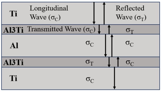 R is the wave impedance, ρ is the material density, and C is the wave velocity. The wave impedances of the components of the Ti-Al3Ti laminated composite are shown in Table 7. According to Table 7, we can confirm that the reflected and transmitted waves at the Ti-Al3Ti interface are compressive and tensile stress waves, respectively, and that the reflected wave at the Al3Ti-Al interface is a tensile wave, as shown in Figure 16.