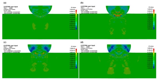 XY-plane stress distribution of a circular projectile with a penetration velocity of 400 m/s (a), 600 m/s (b), 800 m/s (c), and 1000 m/s (d) penetrating a Ti layer with a thickness of 0.1 mm.