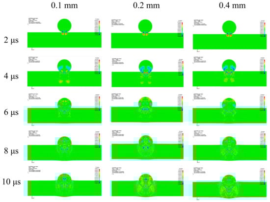 To study the influence of the layer thickness on the stress wave characteristics of the target, we obtained the XY stress distributions of the Ti-Al3Ti laminated composites with different Ti layer thicknesses at 2–10 μs through the post-processing software, as shown in Figure 18. Among them, at 4–10 μs, with the increase in the Ti layer thickness, the stress distribution in the target changes from a stress concentration at 35° to a more circular diffuse distribution with a larger load action range. Each layer has more Al3Ti to absorb the impact load, and the maximum stress value at the front of the projectile at the same time gradually decreases. This is because the increase in the Ti layer thickness changes the reflection frequency of the stress wave, reduces the intensity and velocity of the superimposed stress wave, and changes the maximum stress value and distribution form.