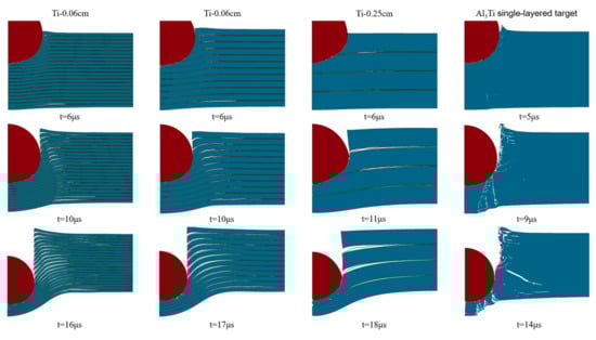 Figure 8 and Figure 20 show the damage evaluations of different configurations of MIL composite targets penetrated by tungsten alloy projectiles with an impact velocity of 1000 m/s. Obviously, the crack initiation, propagation, morphology, distribution, and delamination (spalling) can be analyzed according to these simulated images collected at different times. In Figure 20, we can see that when the projectile penetrates the MIL composite target, the projectile is blunted and damaged, and with the increase in the Ti layer thickness, the damage and blunting phenomena of the projectile are aggravated, and the velocity of the projectile is significantly reduced. This indicates that the thick Ti matrix significantly increases the penetration resistance of the projectile, especially in the initial and middle stages of penetration (approximately before 11 μs).