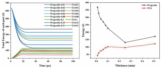 (left) Penetration energy–time history plot and (right) energy–thickness relations of the projectile and Ti layer in the Ti-Al3Ti target at a velocity of 1000 m/s.