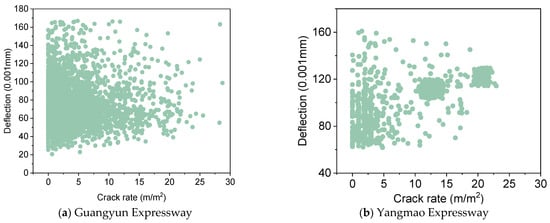 In summary, the correlation between the deflection and crack rate indicators of the two roads is positive, and the higher the crack rate, the higher the deflection. The slope of the Guangyun Expressway is 1.02, while the slope of Yangmao Expressway is 1.60, which is quite different. The main reason for this difference is that the pavement structures are different. The pavement structure of the Guangyun Expressway consists of a 22 cm asphalt structure layer and a 56 cm cement-stabilized gravel structure layer, while the pavement structure of the Yangmao Expressway consists of a 15 cm asphalt structure layer and a 56 cm cement-stabilized gravel structure layer. Both are typical semi-rigid asphalt pavement structures. Due to the subtropical region, low temperatures are relatively infrequent, and cracking of the pavement structure occurs mainly in the semi-rigid base layer during operation. Since the Guangyun Expressway has a thick asphalt structural layer, if the cement-stabilized gravel layer cracks, the strength of the road structure is more likely to be maintained by the thick asphalt structural layer. However, the strength of the road structure with a thin asphalt structural layer is more likely to be affected by the cracking of the cement-stabilized graded aggregate layer. Therefore, there will be some difference in the slopes of the fitting models of the two roads. However, it is clear that the cracking rate is positively correlated with the deflection index. Therefore, the statistical analysis of the crack rate can be used to characterize the deflection.