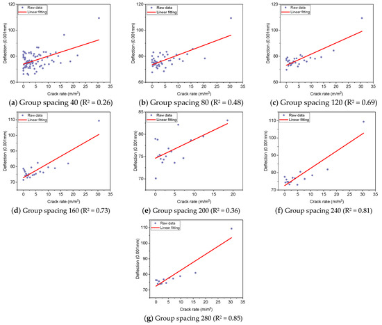 As illustrated in Figure 2, with the increase of the group spacing, R2 values tend to increase. An evident correlation between crack rate and deflection emerges as group spacing is increased. The data demonstrate a positive relationship between deflection and crack rate, exhibiting a notable linear trend. Consequently, a linear model was employed for the fitting analysis, with multiples of 10 designated as the group spacing. The analysis was conducted for various group spacings, and the results are presented in Figure 3 and Figure 4 and Table 1.