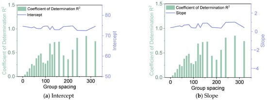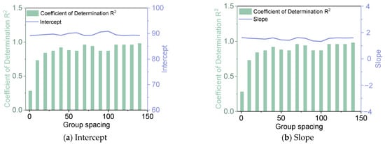As illustrated in Figure 3 and Table 1, the intercept indicators of different subgroups demonstrate a high degree of similarity, with an average intercept value of 74 and a coefficient of variation of only 1%. However, the slope indicators demonstrate significant variations, with an average slope value of 0.60 and a coefficient of variation as high as 35%. The average value of the coefficient of determination R2 is 0.48, and the coefficient of variation is 58%. The coefficient of determination R2 indicator reveals that the fitting results vary considerably, and as a whole, they tend to increase with the increase of the subgroup spacing. According to the fitting results, although there is a large variation in the slope, it can still reflect the positive correlation between crack rate and deflection, with the higher the crack rate, the greater the deflection. According to the fitting results of the coefficient of determination R2, the data fitting effect is optimal when the group spacing is 280, the intercept is 72.5 and the slope is 1.02.