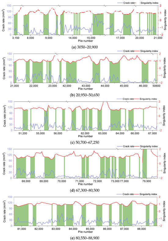 As illustrated in Figure 5, the intersection point solution indicates that when α > 1.15 or α < 0.94, the data is considered abnormal, exhibiting either a low crack rate or a high crack rate. To elucidate the impact of the singularity index, the singularity index and crack rate data are plotted for analysis, as depicted in Figure 6. To identify sections exhibiting a high crack rate, the data set with α < 0.94 is highlighted in green. As demonstrated in Figure 6, the singularity index is more effective at identifying data points with a high crack rate. However, the distribution of these points is too diffuse, making it impractical to test all of the data for deflection, as this would require the interruption of traffic in the lane. Consequently, it is essential to further segment the characteristic data and select the most indicative segments based on the prevailing conditions.