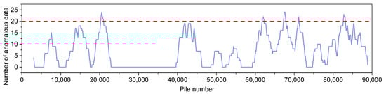 Number of abnormal data (the statistical area starts at the abscissa pile number and extends in the direction of increasing pile number for 2 km).