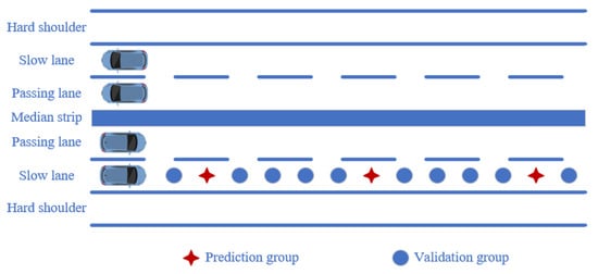 In order to further analyze the effect of Kriging interpolation of multi-lane data, the data of the slow lane and hard shoulder are statistically analyzed. Due to certain deviations in the data correspondence during the actual detection process, in order to further reduce the impact of the correspondence, only the data from 63,000–83,000 are used for the analysis of multi-lane data. To facilitate a comprehensive comparison of the effects of analyzing data from a single-lane, one-way lanes, and two-way lanes, the data was filtered into four prediction groups with intervals of 100 m, 200 m, 500 m, and 1000 m. The remaining data from the slow lane on the right were designated as the verification group. The schematic diagram is shown in Figure 11. The results of the interpolation are illustrated in Figure 12.
