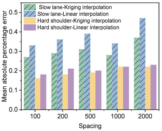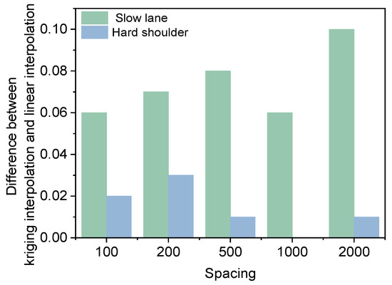 As demonstrated in Figure 9, there are substantial discrepancies in the mean absolute percentage error of interpolation results in different lanes. The mean absolute percentage error of interpolation in the slow lane is notably higher than that in the hard shoulder, primarily due to the significantly higher coefficient of variation of the deflection in the slow lane compared to the hard shoulder. When data exhibits substantial variation, attaining a satisfactory interpolation outcome becomes challenging. The mean absolute percentage error of Kriging interpolation is consistently smaller than that of linear interpolation, thereby substantiating the superiority of the Kriging interpolation method. As the spacing of the data in the prediction group increases, the mean absolute percentage error of both Kriging and linear interpolation exhibit a tendency to increase. As illustrated in Figure 10, the difference between the mean absolute percentage error of Kriging interpolation and linear interpolation in the slow lane is greater than that in the hard shoulder, suggesting that the Kriging interpolation method may be more effective than the linear interpolation method when the sample data exhibits high variability.