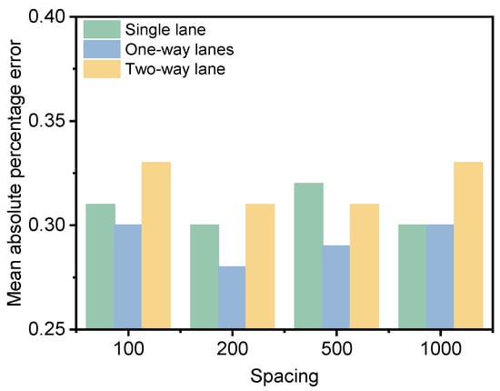 There is a significant difference in the mean absolute percentage error of the interpolation of the slow lane, hard shoulder, one-way lane and two-way lane Kriging. Even if the distance of the predicted group data is 100 m, the mean absolute percentage error of the slow lane interpolation reaches 0.26. However, the mean absolute percentage error of the hard shoulder interpolation is only 0.16, and there is a significant difference in the interpolation effect between the slow lane and the hard shoulder. In order to further analyze the main reasons for the differences, the coefficients of variation of the prediction group, the coefficients of variation of the validation group and the mean absolute percentage error of the interpolation results were analyzed in correspondence. The results are presented in Figure 13.