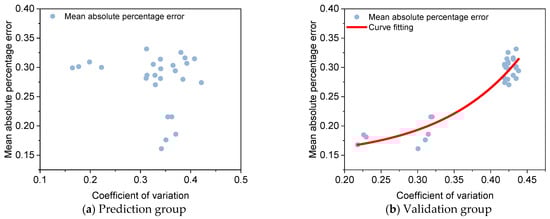 As can be seen from Figure 13, the coefficient of variation of the prediction group’s data has no direct relationship with the effect of Kriging interpolation, but there is an obvious non-linear relationship between the coefficient of variation of the validation group and the effect of Kriging interpolation; the fitting model is shown in Equation (4), and the coefficient of determination R2 reaches 0.89. In summary, it can be seen that the effect of Kriging interpolation and the variability phenomenon of the data itself are closely related. The Kriging interpolation method cannot predict the sudden variation phenomenon, but for continuous data, the variation can be effectively predicted. If the data itself varies more, the effect of Kriging interpolation will be greatly reduced.