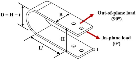 Seismic design increasingly relies on energy dissipation devices to protect structures by absorbing earthquake energy. These devices act as sacrificial fuses, yielding or deforming in a controlled manner so that the primary structural elements remain mostly elastic [1,2,3,4,5]. In bridges, which are critical components of transportation networks, such devices are especially important since preserving bridge integrity during earthquakes is vital for safety and post-event connectivity. Accordingly, modern seismic design codes and retrofitting strategies for bridges often incorporate passive damping elements (e.g., metallic dampers, base isolators, shock absorbers) to limit seismic forces and displacements. These energy dissipation systems have been used successfully in bridge bearings and connections to reduce vibrations, and they are becoming an integral part of resilient bridge design [6]. In that context, one promising type of metallic damper is the U-shaped flexural plate (UFP), which consists of a steel plate bent into a “U” shape that dissipates energy through flexural or torsional yielding of its arms as shown in Figure 1. The geometric parameters of UFPs are the overall height (H), width (B), plate thickness (t), diameter (D) of the semicircle, and length (L’) of the straight part without bolt holes.