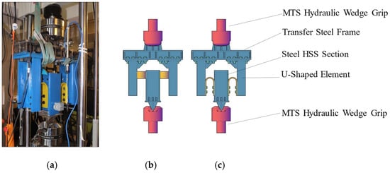 Forty-six (46) tests were carried out using an MTS 810 unidirectional testing machine powered by an MTS 505.30 hydraulic pump. A specially designed steel frame structure was installed on the testing machine to accommodate the UFPs. Figure 2 shows the experimental setup as implemented in the laboratory, along with a schematic diagram that clearly identifies each component of the testing system. Since UFP elements generate out-of-plane forces when deforming (as they tend to open laterally), a symmetrical system was developed to counteract and neutralize these forces. Consequently, two UFPs were utilized for tests conducted at 0° (in-plane), whereas four elements were employed for the 90° tests (out-of-plane).