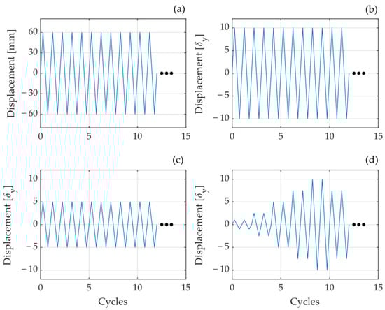 Four loading protocols were selected to investigate the fatigue life of these elements, as shown in Figure 3. The Fatigue 1 protocol consists of cycles with a constant amplitude of 60 mm. Protocols Fatigue 2 and Fatigue 3 involve constant amplitude cycles equal to 10 and 5 times the yield displacement of the UFPs, respectively. The yield displacement () is calculated using Equation (1) proposed by Baird et al. [16], where is the yield force calculated using Equation (6). Lastly, the fourth protocol, referred to as Increasing Amplitude, is based on the loading protocol for the qualification of buckling restrained braces (BRBs) defined by AISC341 [33]. In this protocol, the design displacement was set as 5 times the yield displacement. Each of these protocols includes an indefinite number of cycles repeated until specimen failure occurs.