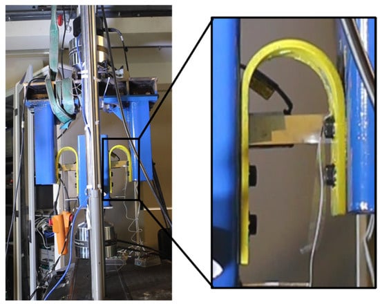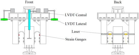 The instrumentation employed included the built-in sensors of the MTS testing machine, consisting of a linear variable differential transformer (LVDT) displacement sensor with a ±80 mm range and a load cell embedded in the upper grip, capable of measuring forces up to ±10 kN. Additional instrumentation, depicted in Figure 4, was also incorporated. A central LVDT with a ±100 mm displacement range was installed to measure the relative displacement of the UFPs more directly and accurately compared to the integrated machine sensor. Side-mounted LVDTs were included to monitor potential outward deformation or opening of the loading frame caused by out-of-plane forces generated by the UFPs. Furthermore, laser displacement sensors were positioned to provide redundancy in the measurement of relative displacement of the UFPs and to detect any possible rotation of the loading frame due to imbalances in specimen forces. Lastly, strain gauges were placed between the round and straight sections of the specimens to precisely determine the onset of yielding in these devices.