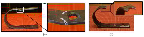 In the case of loading applied at 90°, the deformation mode observed is illustrated in Figure 7a, showing how the deformation involves torsional plastic hinges forming in the region connecting the straight and curved sections of the UFP. Additionally, Figure 7b reveals out-of-plane deformation caused by the absence of lateral infinite planes that would ideally restrain the UFP elements. As cycling continued, cracks appeared in regions where torsional plastic hinges formed. These cracks were clearly associated with repeated cyclic loading. Figure 7b further demonstrates an out-of-plane deformation due to insufficient lateral support, emphasizing the necessity of lateral restraints for preventing undesired behavior. Eventually, after a significant number of cycles, cracks developed into semicircular fractures, as depicted in Figure 8. This distinctive semicircular fracture pattern signifies the ultimate failure mode of specimens subjected to out-of-plane loading (90°), a characteristic feature of a torsional plastic hinge.