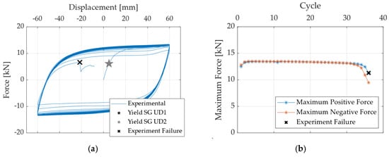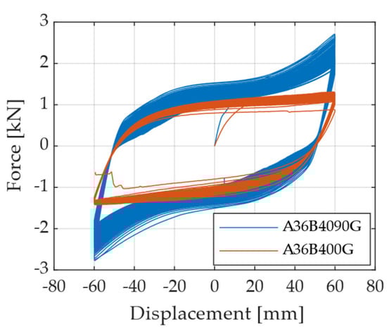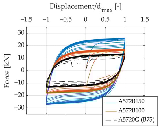 Figure 9 shows the hysteresis curves obtained for specimen A572-0G subjected to the Fatigue 1 loading protocol, highlighting that the maximum force reached in each cycle remains almost constant after several cycles. The strain gauges (SGs) accurately captured the initial yielding point of the specimen.