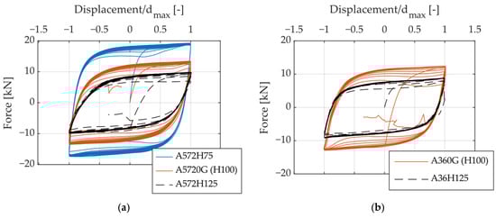 Hysteresis curves illustrating the effect of varying the height (H): (a) A572, (b) A36.