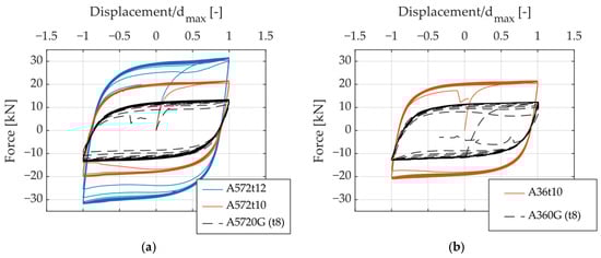 Hysteresis curves illustrating the effect of varying thickness (t): (a) A572, (b) A36.
