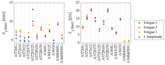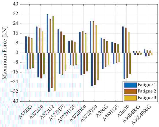 Figure 14 presents the maximum and minimum forces recorded for each specimen under the Fatigue 1, Fatigue 2, and Fatigue 3 loading protocols. The symmetry in the hysteresis curves for positive and negative load directions is clear from this graph. Additionally, the figure shows that forces do not significantly decrease between the Fatigue 1 and Fatigue 3 protocols, with differences lower than 20%. This indicates that, once the UFP elements reach displacement demands of around five times their yield displacement, they reach forces approaching their maximum capacity. Moreover, regarding the influence of steel type (A572 vs. A36), the results indicate that, in general, specimens fabricated from A36 steel exhibit slightly lower maximum forces across all fatigue protocols. This difference can be attributed to the inherent variation in tensile strength between the two materials: A36 steel typically ranges from 400 to 550 MPa, while A572 Grade 50 offers a higher range of approximately 450 to 620 MPa. As a result, A572 specimens demonstrate a moderately enhanced strength.
