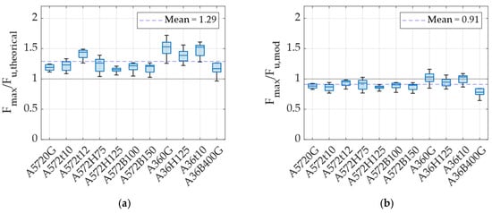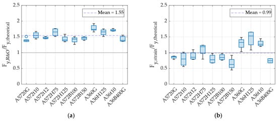 Additionally, the experimentally obtained maximum force was compared with theoretical equations proposed by Deng et al. [24], developed to estimate the maximum force of UFP elements. Equation (2) corresponds to the maximum force generated by the UFP element when loaded at 0°, without considering isotropic strain-hardening effects, whereas Equation (3) accounts for this hardening. In Equation (3), the parameter represents the difference between the ultimate and yield stresses, is the strain-hardening rate, and is a coefficient to be determined experimentally. In this study, takes the value of 5.025, following the work by Deng et al. [24]. Figure 15a presents the ratio of the experimentally measured maximum force for each specimen to the theoretical maximum force predicted by Equation (2). It is observed that, on average, experimental values are approximately 29% higher than theoretical predictions. This discrepancy occurs because Equation (2) does not include isotropic strain-hardening effects, thereby limiting the calculations to the yield stress (). Nonetheless, this equation serves effectively as a conservative lower-bound estimate for the maximum force achievable by a UFP element. Notably, A36 specimens show greater dispersion than A572, likely due to the wider allowable variation in their tensile and yield strength.