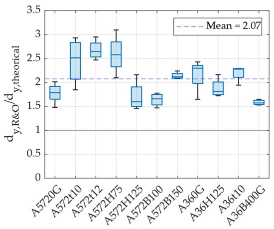 Ratio between the yield displacement obtained using the R&O method and the theoretical yield displacement calculated with Equation (1).