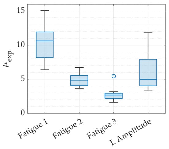 Displacement ductility is a parameter commonly used in the design of energy dissipators for seismic-resistant structures. In this study, the experimental displacement ductility was calculated using the expression , where represents the experimental yield displacement obtained using the Ramberg and Osgood (R&O) method, and corresponds to the maximum displacement applied during testing. Figure 19 illustrates the distribution of ductility values achieved under each loading protocol. The results indicate that ductility varies across specimens depending on the applied protocol, which was expected, as the loading protocols were specifically designed to induce different ductility demands. It is worth noting that the target ductility for Fatigue 2 was set at 10, while for Fatigue 3, it was 5. The discrepancy between the expected and experimentally obtained ductility values arises from the method used to define the displacement amplitudes in each protocol. These amplitudes were based on the theoretical yield displacement calculated using Equation (1). As previously discussed, this theoretical value differs from the experimentally determined yield displacement obtained through the Ramberg and Osgood fitting approach, leading to variations in the final ductility measurements.