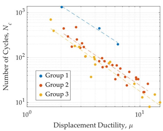 Based on the obtained results, exponential fitting curves were derived for each H/t ratio group, as presented in Equations (9)–(11), for groups 1, 2, and 3, respectively. In these equations, Nc represents the number of cycles to failure, while μ denotes the achieved ductility. These equations are expressed in terms of displacement ductility, as this parameter is commonly used in the design of energy dissipators for seismic-resistant structures.