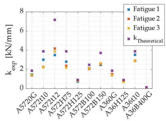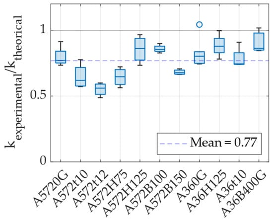 Figure 22 shows the ratio between experimental and theoretical stiffness. On average, experimental stiffness was found to be 23% lower than the theoretical prediction given by Equation (12), with the A36 specimens showing results that more closely aligned with theoretical values. One possible explanation for this discrepancy lies in the manufacturing process of the UFP elements. These devices were cold formed using rollers to shape the curved section, a process that may have introduced residual stress and permanent deformations, potentially affecting the overall stiffness. Despite this difference, the average experimental-to-theoretical stiffness ratio can be used as a correction factor for estimating the actual stiffness of these specific UFP elements. Using this approach, Equation (13) allows for the estimation of the experimental stiffness of a UFP element loaded at 0° based on its theoretical stiffness.