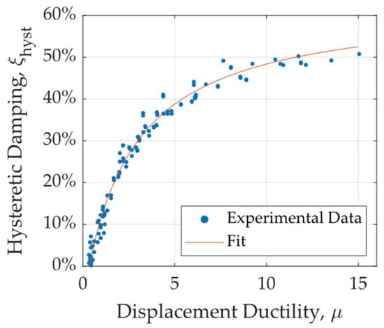Hysteretic damping is a parameter used to quantify the energy dissipation capacity of a structure or system due to nonlinear behavior. It is computed using Equation (14), where represents the energy dissipated per cycle, while and correspond to the maximum force and displacement attained during a given cycle [35]. Figure 23 presents the hysteretic damping values obtained for different specimens under various ductility demands. The results indicate that UFP elements achieve damping values exceeding 45% as ductility increases. Additionally, for ductility levels greater than 5, damping consistently exceeds 40%, which is considered an appropriate level for the expected deformation demands in energy dissipation applications. To facilitate damping estimation, a rational curve fit was applied to the data, allowing for the prediction of hysteretic damping as a function of displacement ductility demand. The importance of this curve lies in its practical application for estimating the damping contribution of UFP dissipators at various ductility levels. The corresponding equation is presented as Equation (15), which can be utilized to estimate the added hysteretic damping provided by these devices during a displacement-based or performance-based seismic design of structures.